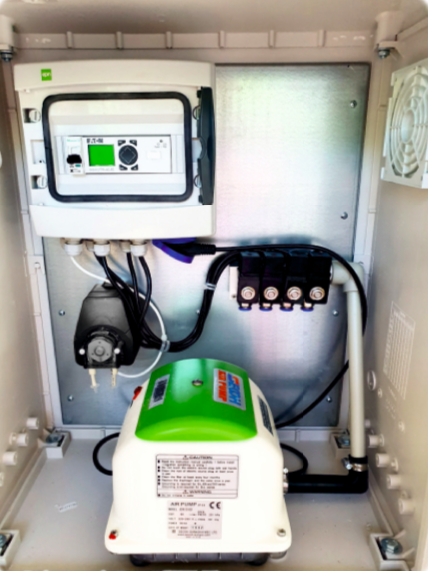 Робота очисної споруди контролюється автоматично через технічний контейнер. Однофазне живлення підключено до блоку керування роботою очисної споруди та насоса EBARA OTPIMA MA (0,25 кВт).