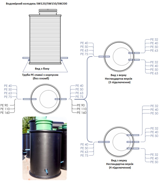 Фланці (встановлені всередині камери) пропонуються як додаткові аксесуари. Замовляючи їх, вкажіть точну відстань, яка дозволить вам вставити відповідне обладнання. Пропоновані підключення варіюються від PE 32 до PE 110. За бажанням замовника можливе виконання більше двох підключень, в залежності від типу водомірної камери.